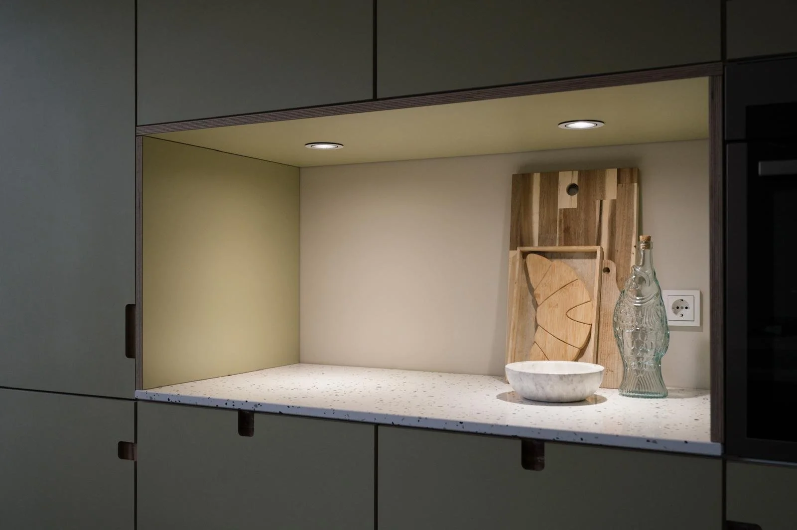 De betonnen gietvloer vroeg om zachtere, warmere materialen. Daarom koos ik voor een donker eiken kookeiland, gecombineerd met een groene achterwand voor een frisse touch. Het terrazzo blad brengt speelsheid en verbindt de verschillende materialen met elkaar.