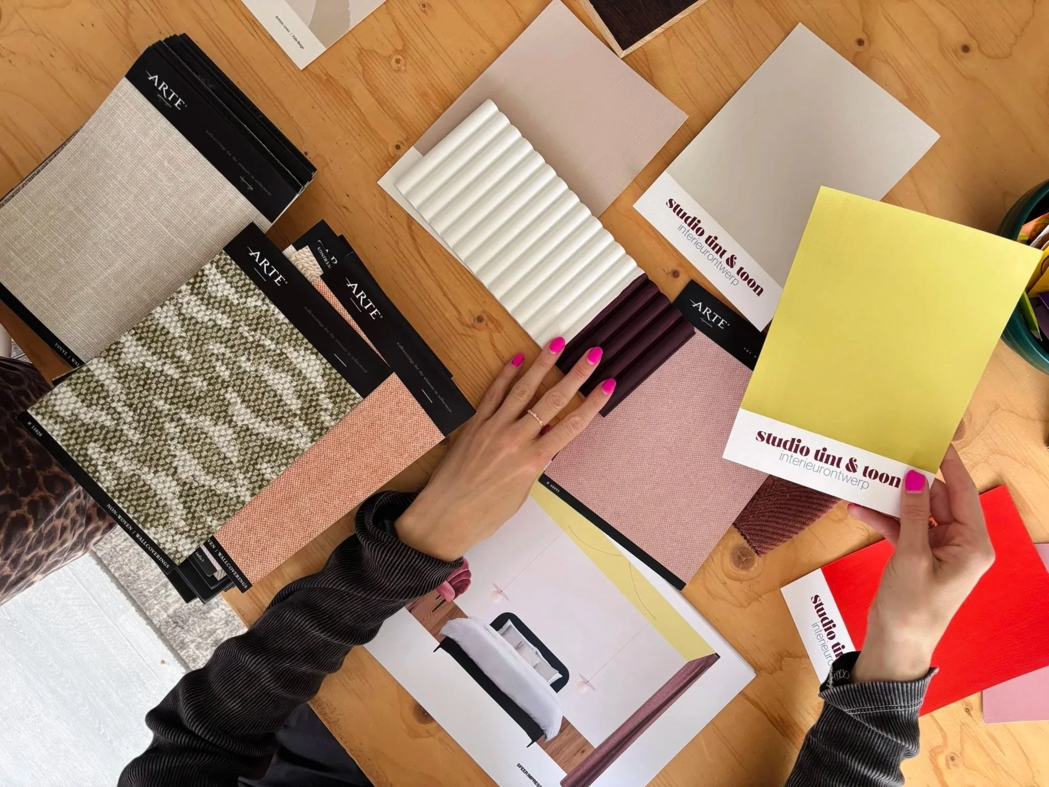 Voor de verfkleuren voeg ik, naast een kleurstaal, altijd een kleurentester toe. Hiermee kun je de kleur direct op de muur aanbrengen en het effect in de ruimte goed beoordelen. Zo krijg je een realistisch beeld van hoe het ontwerp in de praktijk tot leven komt.
